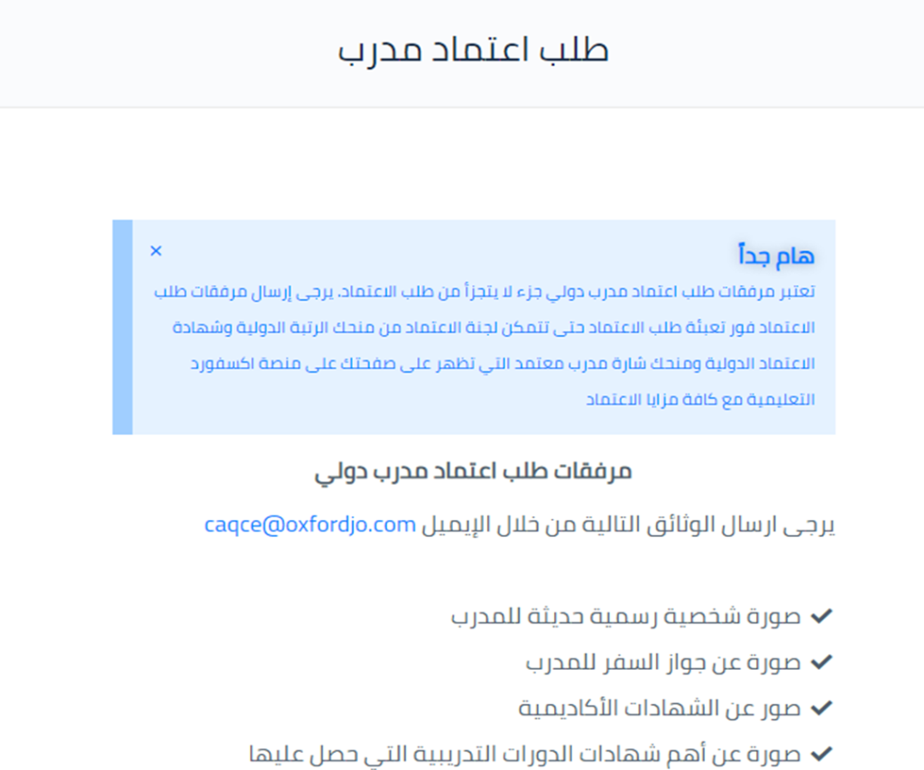 طلب اعتماد مدرب فقط للأعضاء المسجلين على المنصة (للتسجيل اضغط هنا) لتقديم طلب الاعتماد الدولي من OAB-UKوالحصول على صفة مدرب معتمد دوليا والاستفادة من ميزات…